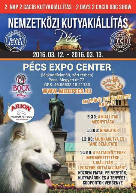 A MEOE Pécsi Önálló Jogú Egyesülete 2 x CACIB nemzetközi kutyakiállítást szervez Európa egyik kulturális fővárosába, Pécsre, 2016. Március 12.-ére és 13.-ára. A Nemzetközi kutyakiállításoknak az Expo Center Pécs Multifunkcionális Kiállítási és Rendezvényközpont ad otthont.