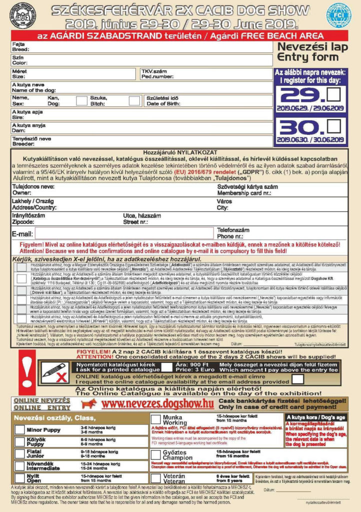 Postai nevezés esetén, a nevezési lap pontos kitöltése és aláírása után, csatolni kell a nevezni kívánt kutya törzskönyv másolatát, a nevezési díj igazolásához a befizetett csekk vagy átutalási bizonylat másolatát, Champion vagy Munka bizonyítványok másolatát (ha van) és a 2019. évi szövetségi tagkártya másolatát.